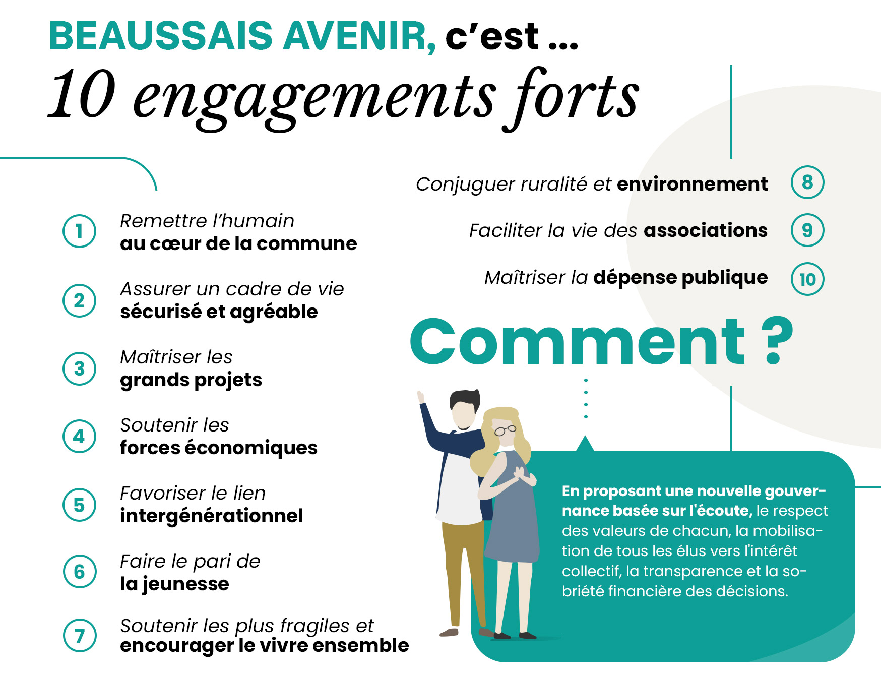 Plus qu'un homme, c'est une équipe unie et compétente qui se présente à vous. Par la force du lien qu'elle créera avec vous et par l'écoute qu'elle aura vis-à-vis des citoyens de Beaussais-sur-mer, elle œuvrera collectivement pour remettre l'humain au cœur de la commune.